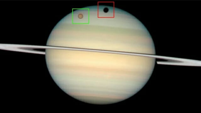 이 현상은 타이탄이 토성 앞을 지나며, 그림자가 토성의 고리 위에 드리워지는 장면입니다.